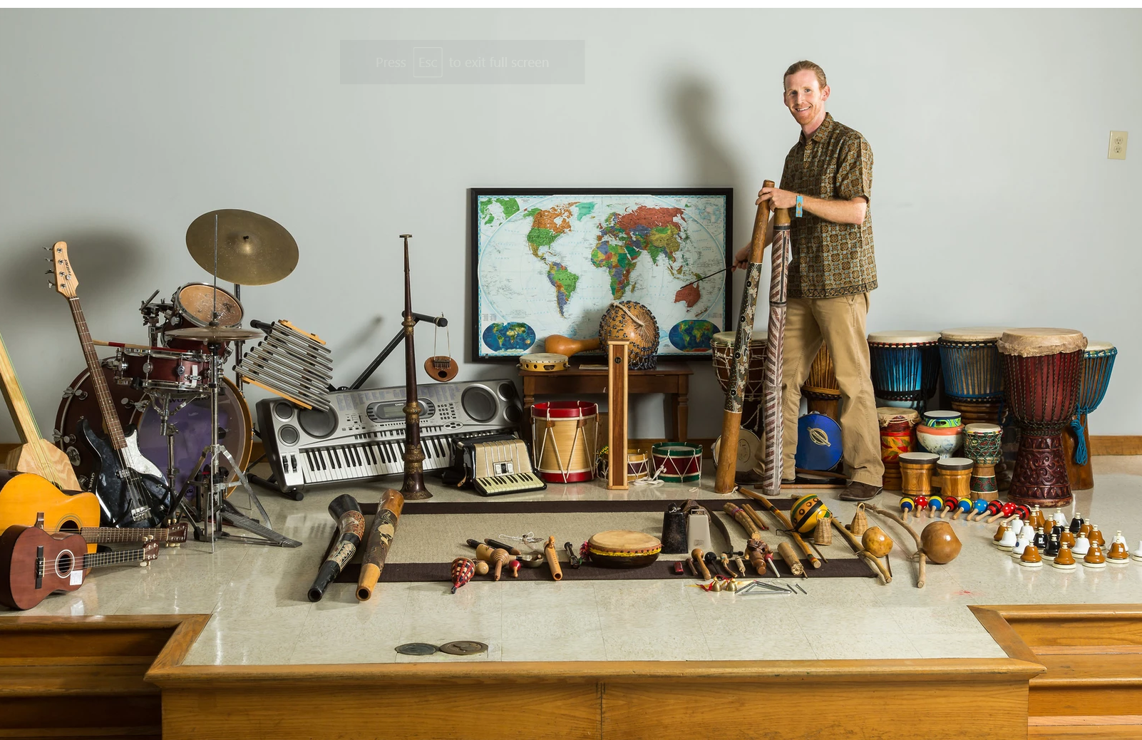 I usually share around twenty different instruments during a one hour presentation. My collection numbers around 140 unique instruments from six continents as well as many relics and artifacts collected from around the world. Much of my collection could be considered organic, traditional or indigenous and made out of natural materials, some very old and some contemporary. I also have many cutting edge pieces of digital music making equipment and instruments that I use to share lessons about the evolution of different styles of music making and the wonders of technology.
